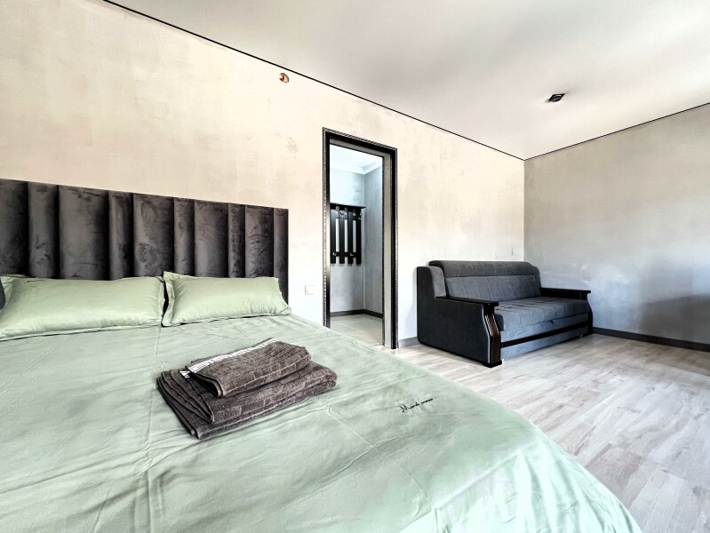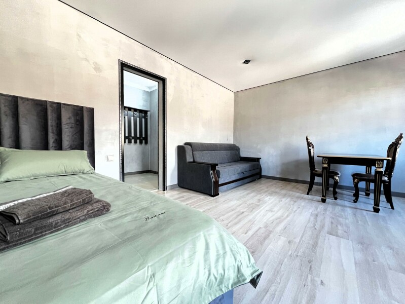 Как неприступный древний аул, спрятавшийся в горах, эти студийные апартаменты на втором этаже — ваше личное, уединённое убежище. Здесь царит атмосфера отрешенности от суеты и полного слияния с горным пейзажем за окном. Ваш компактный форпост с панорамой: Цитадель для двоих: Умное зонирование объединяет уютную зону отдыха с двуспальной кроватью и гостиную с удобным диваном. Всё необходимое для отдыха — в одном пространстве, наполненном светом. Автономный очаг: Отдельная, полностью оборудованная кухня позволяет чувствовать себя совершенно независимо и готовить с видом на вечные вершины. Источник свежести: Современная душевая комната, чтобы смыть усталость и ощутить бодрящую энергию горных родников. Вид, который лечит: Панорамное окно — главная ценность апартаментов. Ваша бесконечная картина, которая меняется в течение дня, напоминая о величии природы. Идеально для романтического путешествия или для самостоятельного исследователя, который ценит компактный, продуманный комфорт, личное пространство и диалог с горами тет-а-тет. Забронируйте апартаменты «Гоор» — ваше секретное укрытие с самым честным видом на Дагестан.
